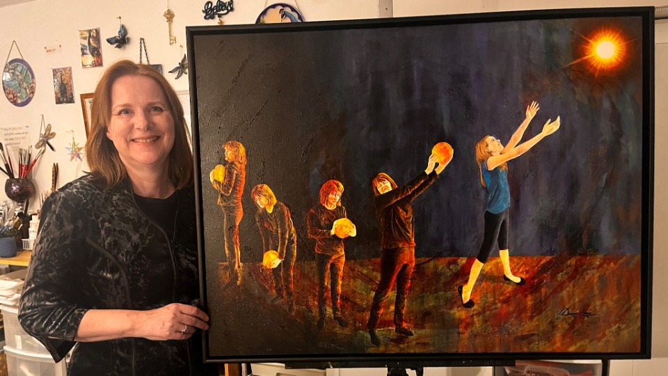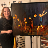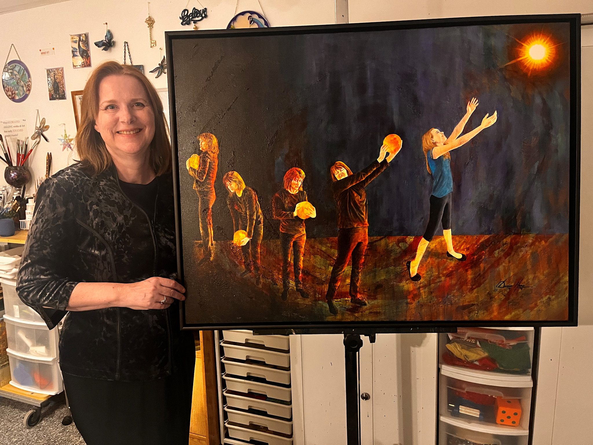 Hoag created the painting to commemorate the 40th anniversary of a profoundly difficult time in her life. She shared, “My aunt passed away from cancer. The day of the funeral, my mother died. My grandmother died soon after. All of these deaths devastated me. I had just turned 13. I was mad at God.”