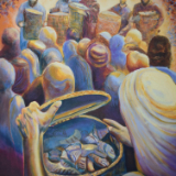 Letting Go and Trusting God” is one of many original paintings on display at the Great Treasures of Gold exhibit. The exhibit also includes other mediums, including tapestries, embroideries, stained glass, cross-stitch creations, and pen and charcoal drawings.